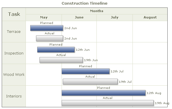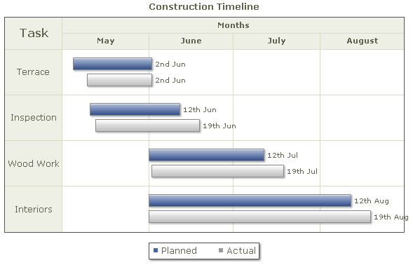 | <chart palette='2' caption='Construction Timeline' dateFormat='dd/mm/yyyy' outputDateFormat='ddds mns' > <categories> <category start='1/5/2008' end='31/8/2008' label='Months' /> </categories> <categories> <category start='1/5/2008' end='31/5/2008' label='May' /> <category start='1/6/2008' end='30/6/2008' label='June' /> <category start='1/7/2008' end='31/7/2008' label='July' /> <category start='1/8/2008' end='31/8/2008' label='August' /> </categories> <processes headerText='Task' headerFontSize='16' fontSize='12'> <process label='Terrace' id='TRC' /> <process label='Inspection' id='INS' /> <process label='Wood Work' id='WDW' /> <process label='Interiors' id='INT' /> </processes> <tasks showEndDate='1'> <task processId='TRC' start='5/5/2008' end='2/6/2008' id='5-1' color='4567aa' height='25%' topPadding='20%' /> <task processId='TRC' start='10/5/2008' end='2/6/2008' id='5' color='EEEEEE' height='25%' topPadding='55%'/> <task processId='INS' start='11/5/2008' end='12/6/2008' id='6-1' color='4567aa' height='25%' topPadding='20%' /> <task processId='INS' start='13/5/2008' end='19/6/2008' id='6' color='EEEEEE' height='25%' topPadding='55%'/> <task processId='WDW' start='1/6/2008' end='12/7/2008' id='7-1' color='4567aa' height='25%' topPadding='20%' /> <task processId='WDW' start='2/6/2008' end='19/7/2008' id='7' color='EEEEEE' height='25%' topPadding='55%'/> <task processId='INT' start='1/6/2008' end='12/8/2008' id='8-1' color='4567aa' height='25%' topPadding='20%' /> <task processId='INT' start='1/6/2008' end='19/8/2008' Id='8' color='EEEEEE' height='25%' topPadding='55%' /> </tasks> <legend> <item label='Planned' color='4567aa' /> <item label='Actual' color='999999' /> </legend> <styles> <definition> <style type='font' name='legendFont' size='13' /> </definition> <application> <apply toObject='Legend' styles='legendFont' /> </application> </styles> </chart> |