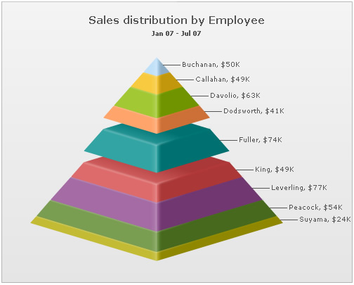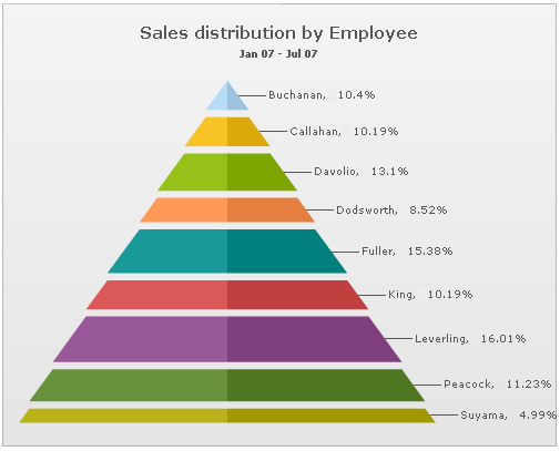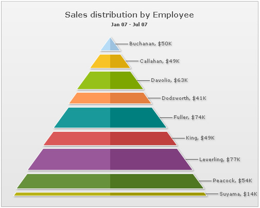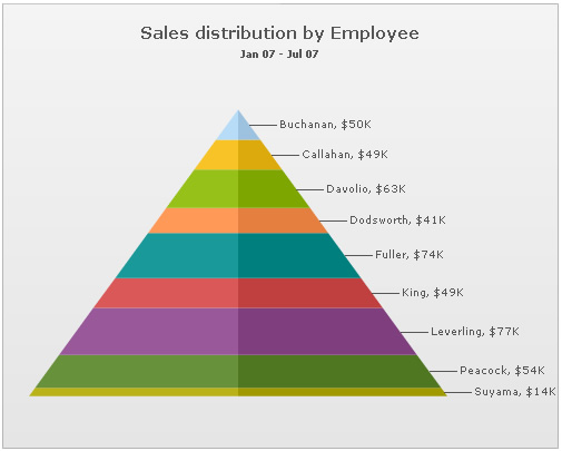 The pyramid chart from FusionWidgets suite allows you to configure various properties using XML. Here, we'll see a few of them: