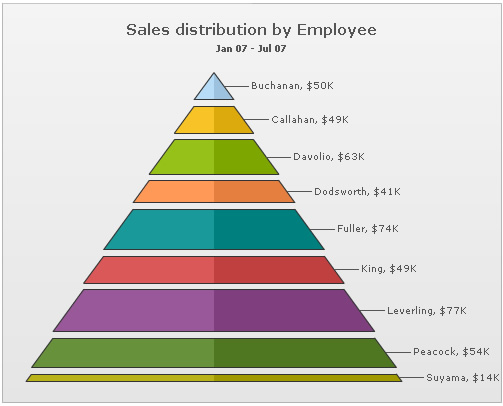 When in 2D mode, you can customize the border properties of the pyramid using: <chart ... is2D='1' isSliced='1' showPlotBorder='1' plotBorderThickness='1' plotBorderAlpha='100' plotBorderColor='333333'> This will result in: |